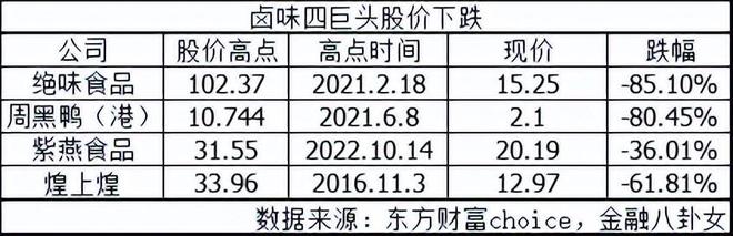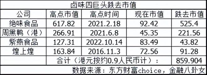四家卤味巨头,从股价高点跌到现在,总共蒸发了859.9亿市值。