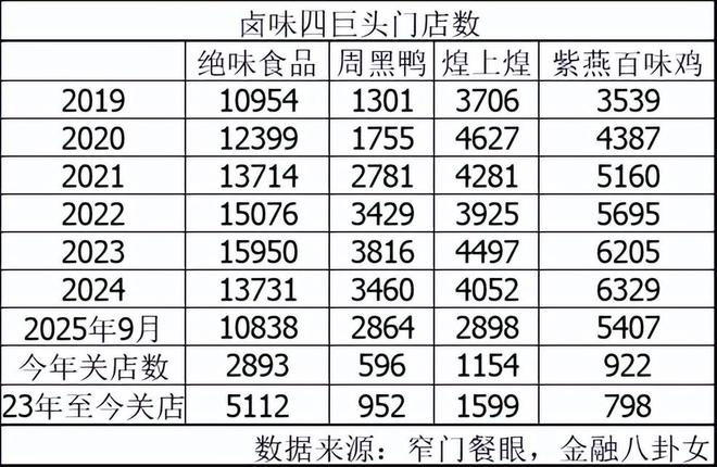 从2023年年底到今年9月8日,周黑鸭、煌上煌和紫燕百味鸡也分别关店952、1599、798家,加上绝味的,四大巨头合计关店8461家。