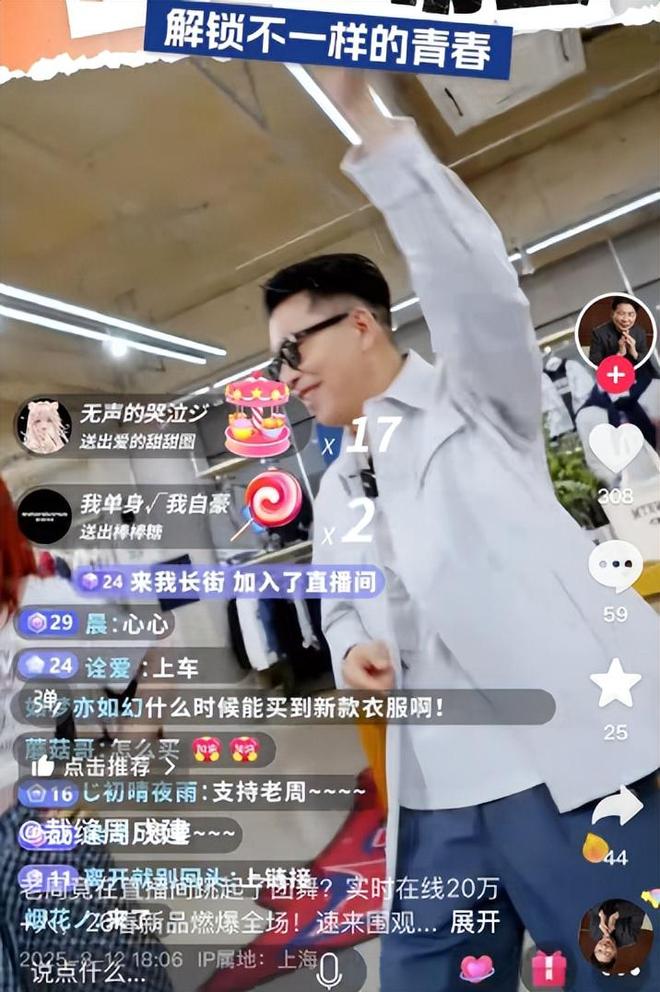 周成建也知道年轻人不想看矫情,直接跳了起来,背景音乐还选了周杰伦的《阳光宅男》。现场气氛相当热烈,周成建有时忘记怎么跳了,旁边助理就带着跳,直播间粉丝量很快超20万。