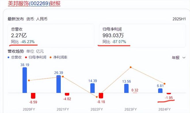 看起来很忙,但效果不尽如人意。2024年,美邦全年营收6.81亿元,同比大幅下降49.79%;归母净利润为-1.95亿元,同比暴跌715.45%。进入2025年,业绩仍未见好转,不久前披露的上半年财报显示,公司营收2.27亿元,同比下跌45.23%;归母净利润993.03万元,同比缩水87.07%。