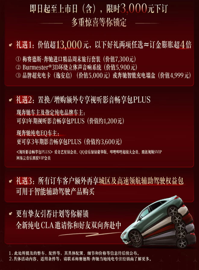 今日上午,全新奔驰纯电CLA正式开启预售,推出两款车型,预售价分别为25.9万元和29.9万元。作为一款主打年轻化与豪华感的纯电轿跑,新车在价格策略与配置组合上颇具吸引力。消费者支付3000元订金即可享受多重购车福利,包括价值7300元的周末旅行套装、5900元的Burmester高端音响系统,以及超充卡或充电墙盒二选一、城区及高速领航辅助驾驶权益包等实用配置。