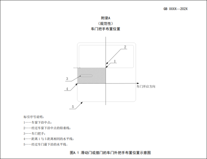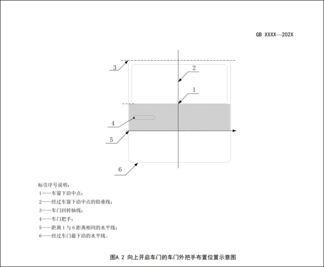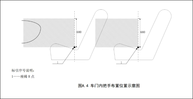 具备机械释放功能的车门内把手应易于车内乘员识别,并满足以下要求:车门内把手应位于无车内构件遮挡的位置,确保在乘员位置直观可见;安装在车门上或距车门边缘不大于 300 mm 的位置;安装在每个车门邻近的外侧座椅 R 点前方,且 R 点上方 0 mm 至680 mm 区域内,车门内把手布置示意图如图 A.4 所示;单个车门配置多个具备机械释放功能的车门内把手时,操作任一车门内把手应能直接开启车门。