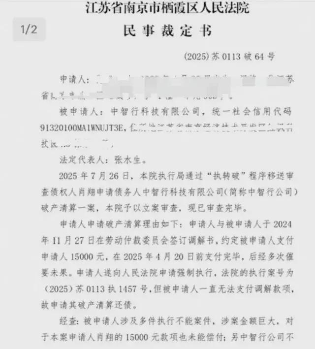 裁定书显示,中智行无力支付1.5万元的劳动仲裁款,被申请破产清算还债,进入"执转破"程序。