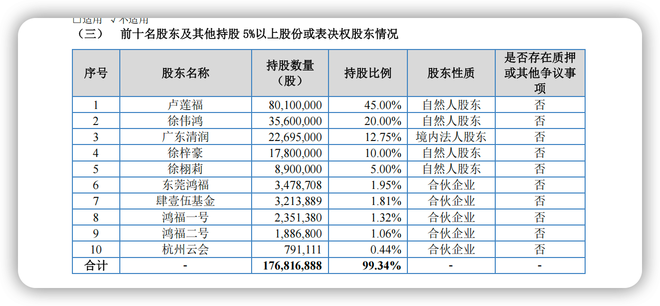 其一致行动人包括徐梓豪(持股10%)、徐栩莉(持股5%)以及鸿福四号(持股0.39%)。徐梓豪与徐栩莉分别为徐伟鸿、卢莲福之子、女;鸿福四号的合伙人则主要为卢莲福兄弟的配偶、外甥及兄弟等亲属。上述各方共计持有公司82.34%的股份,股权集中度较高。