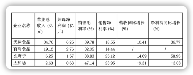 不同的细分赛道也决定了企业各异的市场格局与规模天花板,并最终在营收上呈现出"梯度分布"。财报披露营收数据显示,2024年天味食品营业收入约34.76亿元、百利食品约19.12亿元,幺麻子与太和坊分别约6.25亿元、2.63亿元。
