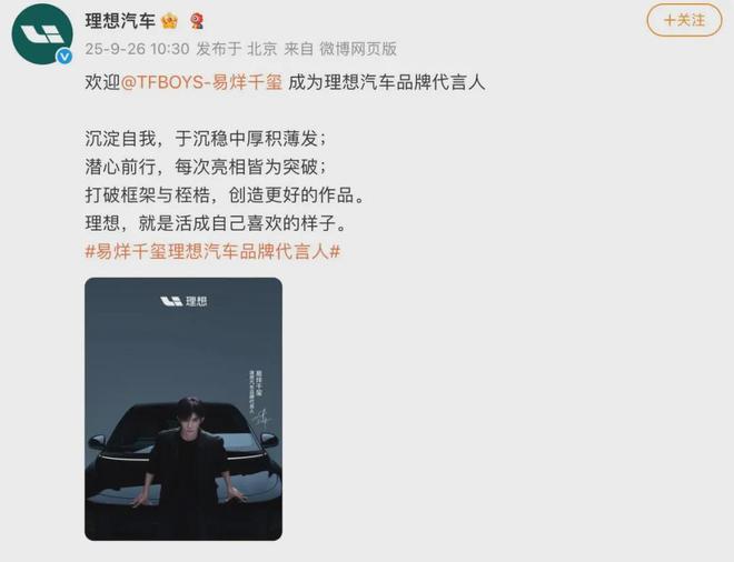 在记者看来,这次易烊千玺成为理想汽车品牌代言人,车业也是某种程度上考虑借助易烊千玺强大的影响力及气质特征,进一步加速大众对新车认知的覆盖,实现强有力冲击市场份额。或者说,这也是车企与流量明星“对位”的一次相互奔赴。
