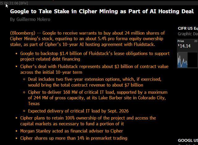 Alphabet旗下的Google(Google)已与加密货币挖矿公司Cipher Mining Inc.达成一项价值30亿美元的数据中心合同,这成为大型科技公司与加密矿企在人工智能算力资源合作上的最新进展。