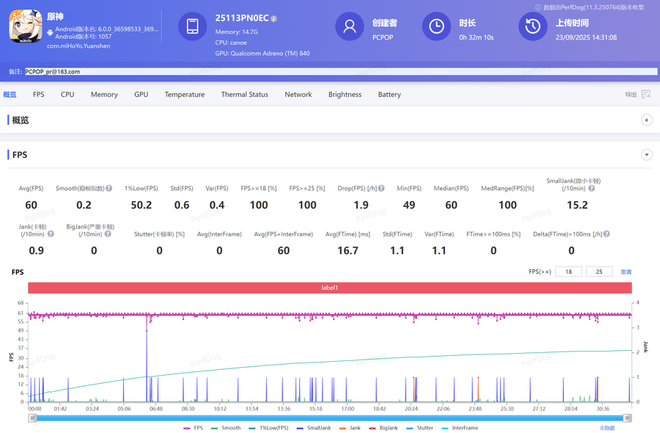 《原神》近期开启了最新6.0版本空月之歌,游戏画质又有了进一步升级优化,在开启高画质+60帧的情况下,我们采用新版本那夏镇跑图作为游戏测试主要方式,该地图复杂,渲染压力大,对数据读写能力的要求高。而Xiaomi 17在半小时分钟的《原神》游戏过程中,PerfDog测试的平均帧率也是达到了60fps的满帧表现,在游戏过程中帧率几乎没有明显波动的情况,整体表现还是十分稳定。半小时游戏后,手机平均功耗仅为3.7W。