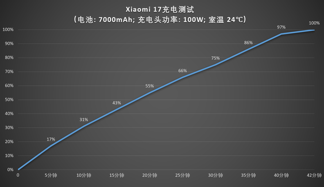 在充电方面,Xiaomi 17支持100W澎湃有线秒充和50W无线秒充,并且首次兼容100W PPS通用协议,充电兼容性更强。实测中,10分钟就能将手机充至30%以上的电量,仅需42分钟就能将这块7000mAh大电池充至满电。