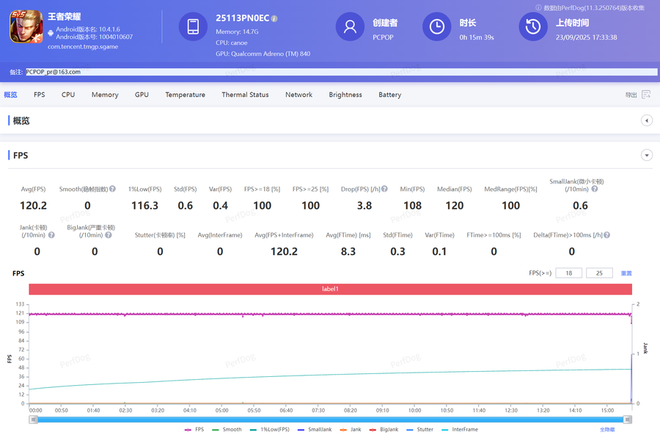 在实际游戏体验中,Xiaomi 17的表现同样令人满意。在《王者荣耀》中,开启极致画面和极高120帧率模式,游戏全程丝滑顺畅,平均帧率稳定在120.1fps。即使是多人团战,帧数也几乎没有波动。