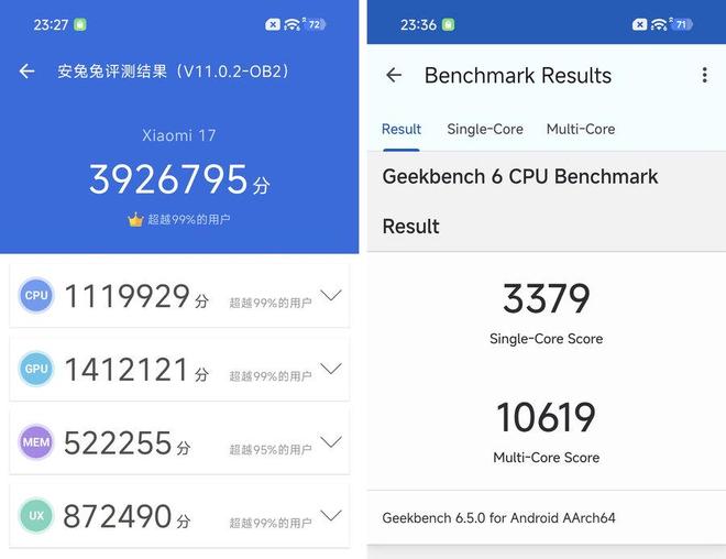 在安兔兔V11版本测试中,Xiaomi 17跑出了超过392万分的好成绩。在GeekBench6.5实测中,CPU单核性能跑分达到3379分,多核性能测试成绩为10619分,单核性能提升超越 20%。多核性能甚至超越了A19 Pro。