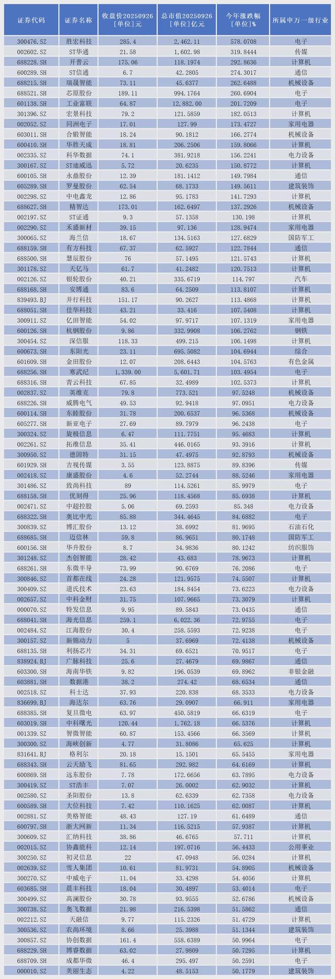 胜宏科技(300476.SZ)、ST华通(002602.SZ)、开普云(688228.SH)、ST信通(600289.SH)、瑞晟智能(688215.SH)、芯原股份(688521.SH)、工业富联(601138.SH)、宏景科技(301396.SZ)、同洲电子(002052.SZ)、合锻智能(603011.SH)、华胜天成(600410.SH)、科华数据(002335.SZ)、ST迪威迅(300167.SZ)、永鼎股份(600105.SH)、罗曼股份(605289.SH)、中电鑫龙(002298.SZ)、精智达(688627.SH)、ST证通(002197.SZ)、禾盛新材(002290.SZ)、海兰信(300065.SZ)、有方科技(688159.SH)、慧辰股份(688500.SH)、天亿马(301178.SZ)、银轮股份(002126.SZ)、安博通(688168.SH)、并行科技(839493.BJ)、佳华科技(688051.SH)、亿田智能(300911.SZ)、杭钢股份(600126.SH)、深信服(300454.SZ)、东阳光(600673.SH)、金田股份(601609.SH)、寒武纪(688256.SH)、青云科技(688316.SH)。