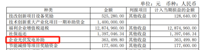 初次被发现三星新材对光伏领域有意,是在2019年,在当年财报的政府补助情况介绍中,出现了“企业光伏发电补助”的字样,补助金额为36.35万元。
