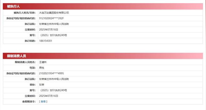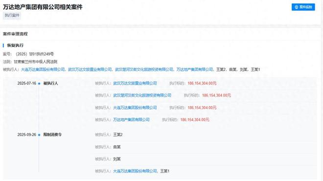 红星资本局通过天眼查App查询发现,相关案件执行标的为1.86亿元,执行法院为甘肃省兰州市中级人民法院,发布时期为9月26日,被执行人涉及武汉万达文旅置业有限公司、武汉楚河汉街文化旅游投资有限公司、大连万达集团股份有限公司、万达地产集团有限公司。