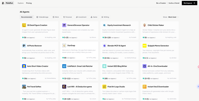 麻辣新闻9月26日讯(记者 武静静)9月16日,MuleRun(中文名"骡子快跑")宣布上线全球首个AI Agent交易市场,面向所有用户开放。这家成立不足一年的初创公司,选择了一个尚处早期但潜力较大的方向:让AI Agent的开发、部署与交易像电商商品一样普及化。阿里云参与了MuleRun的早期投资。