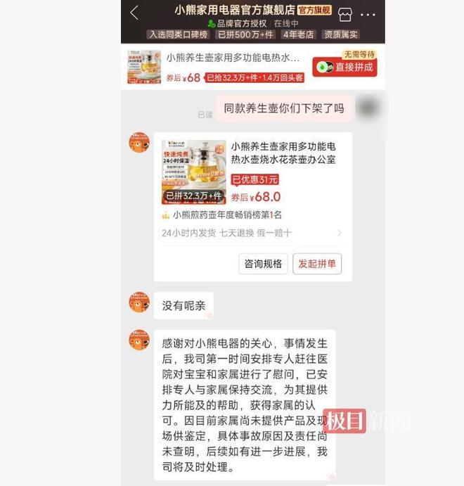小熊养生壶突发炸裂致一岁男宝烫伤,责任待查,同款产品仍在销售