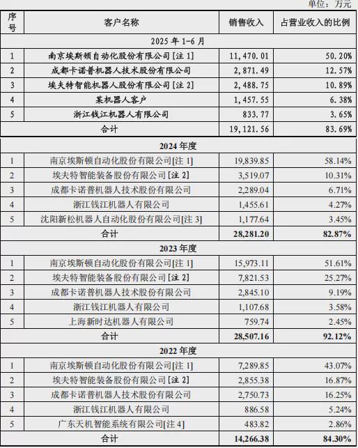 其中,公司对第一大客户埃斯顿的销售收入分别为7289.85万元、15973.11万元、19839.85万元、11470.01万元,占比分别为43.07%、51.61%、58.14%、50.20%,公司对埃斯顿存在重大依赖的风险。