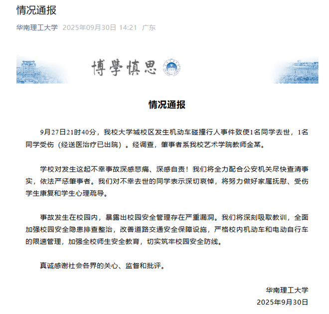 华南理工大学通报校内车祸致一人死亡一人受伤,肇事者身份揭晓,全力调查事实真相