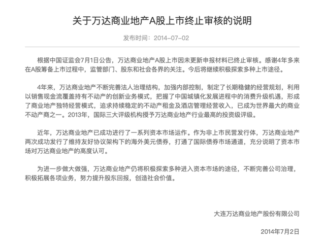 ▲万达商业地产A股上市终止公告 来源:万达官网