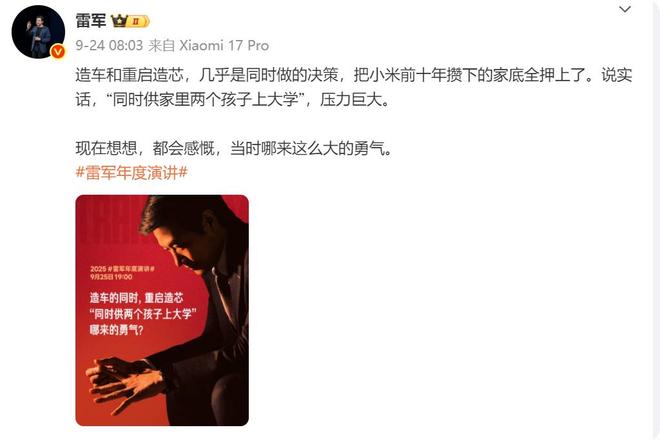 雷军的这番话或是在为9月25日举办的个人第六场演讲铺垫。其个人微博也在9月25日提前作出预告。在微博发文中已经透露演讲时会有小米17、小米平板8系列等新品发布。截至9月26日,雷军以《改变》为主题的个人第六次演讲在线观看人数已经超过5000万,