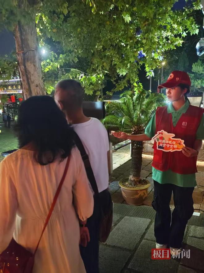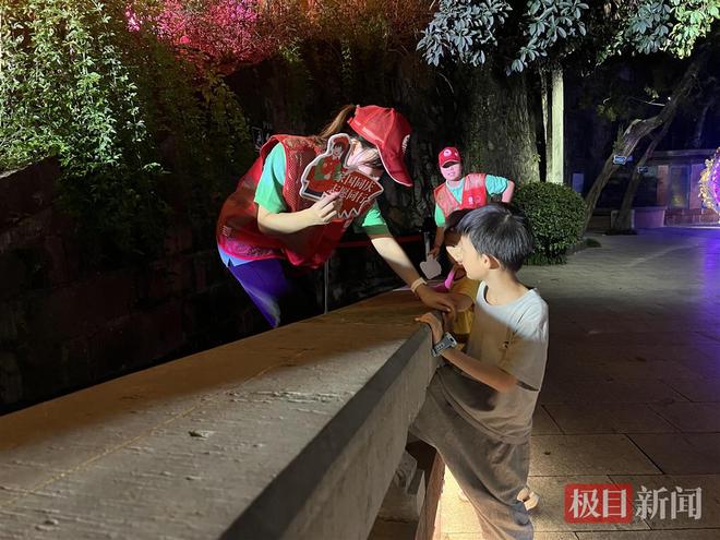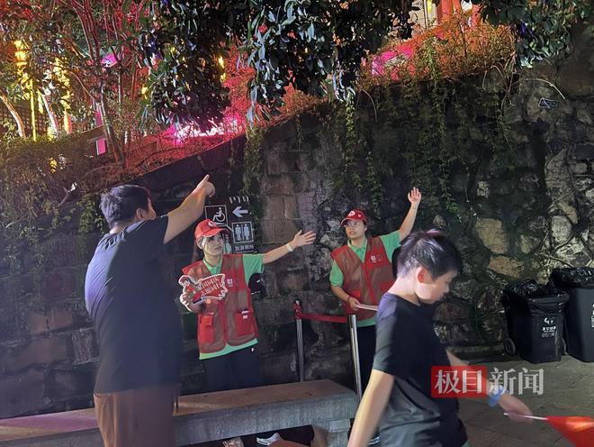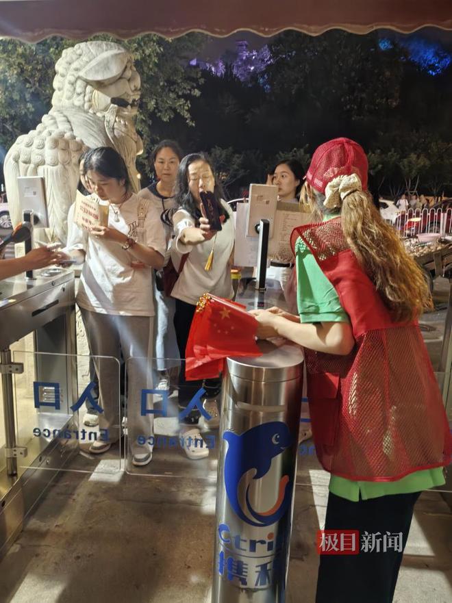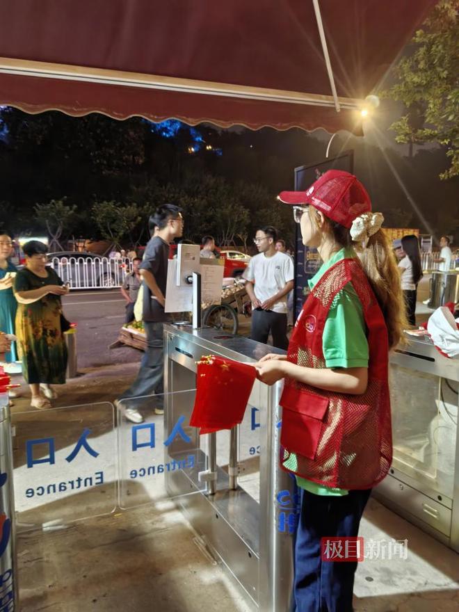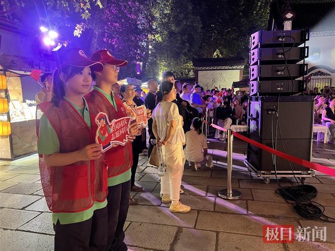 随着傍晚7点30分诗会临近开场,游客市民陆续入场,志愿者们立刻忙碌起来:有的站在入口处引导有序检票,有的穿梭在观众席间耐心解答询问,有的提醒小朋友不要攀爬,以免摔伤。遇到外地游客,她们还主动推荐武汉的特色玩法。