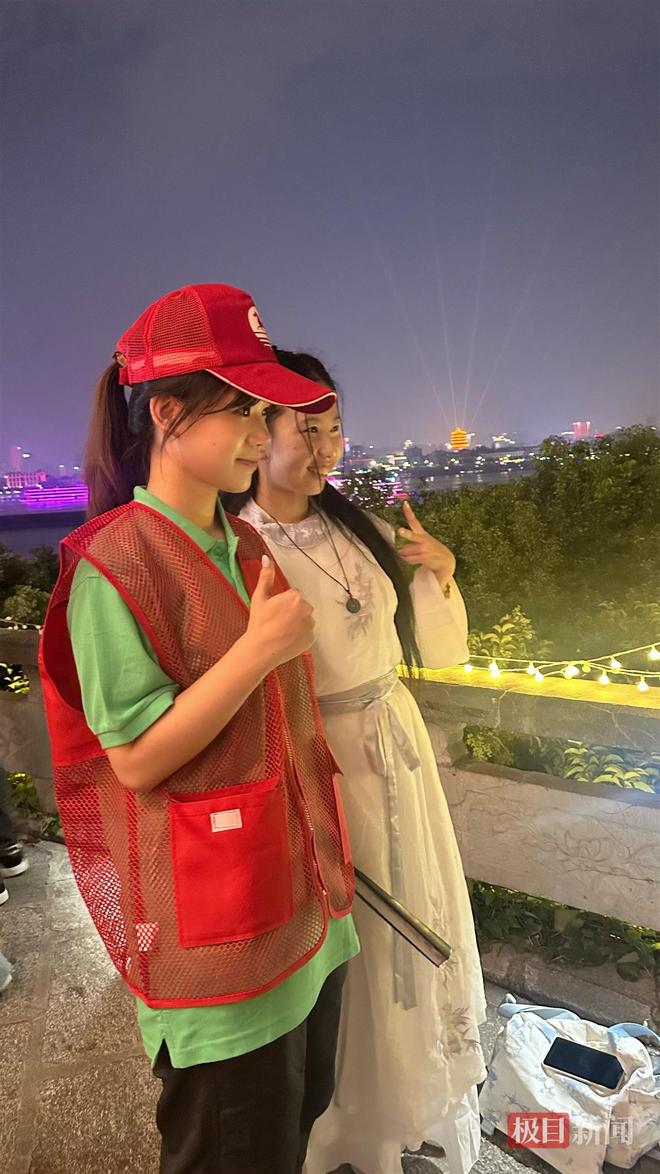 月色皎洁,晴川阁与灯光相映成趣,不少观众想定格这份美好,志愿者们又贴心变身“摄影师”,为他们留下这难忘的瞬间。不少游客还主动拉着志愿者一起合影。