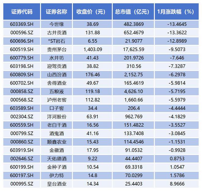 其中,贵州茅台累计下跌9.5%,今世缘、古井贡酒等头部酒企跌幅超过13%。