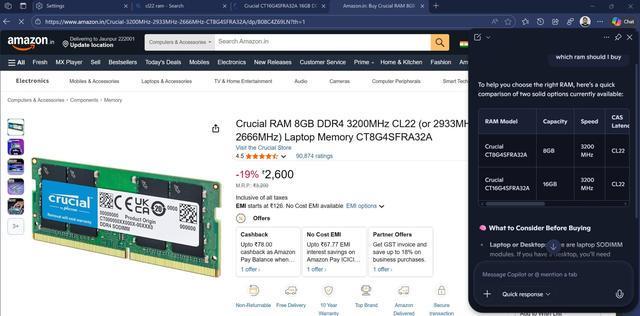 微软Edge已推出类似Copilot模式,支持标签分析。记者在购买Crucial品牌内存条页面进行测试时,Copilot可自动识别页面内容,并精准推荐两款产品,可见AI已经能够理解并响应用户意图。