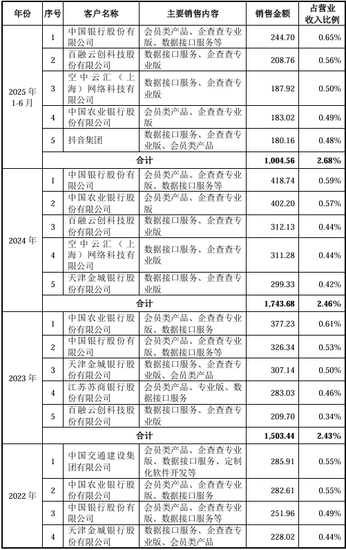 从企查查公布的前五大客户来看,四大行中的中国银行和农业银行每年均和企查查有较大的合作规模。