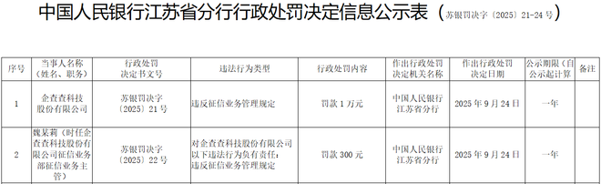 虽然企查查未直接明示和上述客户的具体合作内容,但就在招股书官网的前一天,中国人民银行江苏省分行发布罚单显示,企查查科技股份有限公司因违反征信业务管理规定,被罚款1万元。同时,时任该公司征信业务部征信业务主管魏某莉,对前述违法行为负有责任,被罚300元。