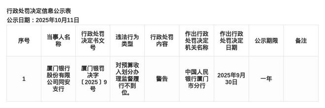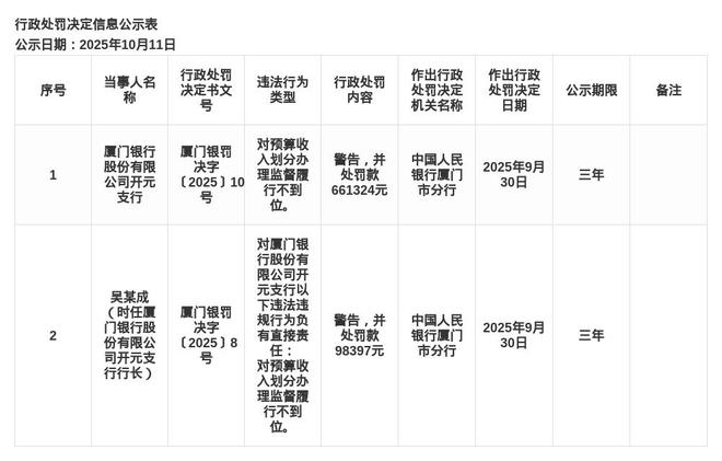 此外,厦门银行股份有限公司开元支行也因对预算收入划分办理监督履行不到位,被警告并处罚款661324元。