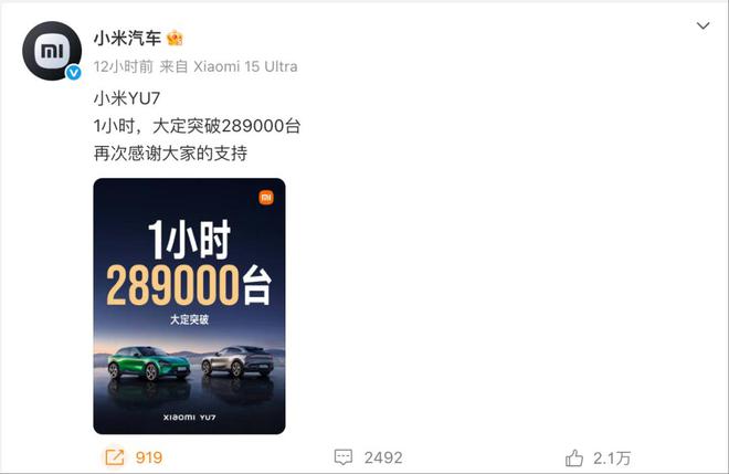 6月26日晚间,小米汽车旗下首款SUV车型——小米YU7正式上市。新车共推出标准版、Pro、Max三个版本车型,售价分别为25.35万元、27.99万元、32.99万元。在当天晚上22点正式开启预订后不久,小米汽车就捷报频传:小米YU7,3分钟,大定突破20万辆;1小时,大定突破28.9万辆。