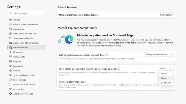 对于仍需使用IE模式访问旧网站的用户,现在必须手动在Edge设置中激活。这一过程包括:进入“设置>默认浏览器”,将“允许网站在Internet Explorer模式下重新加载”切换为“允许”,并将每个需要兼容的网站添加至兼容列表后再手动切换页面。