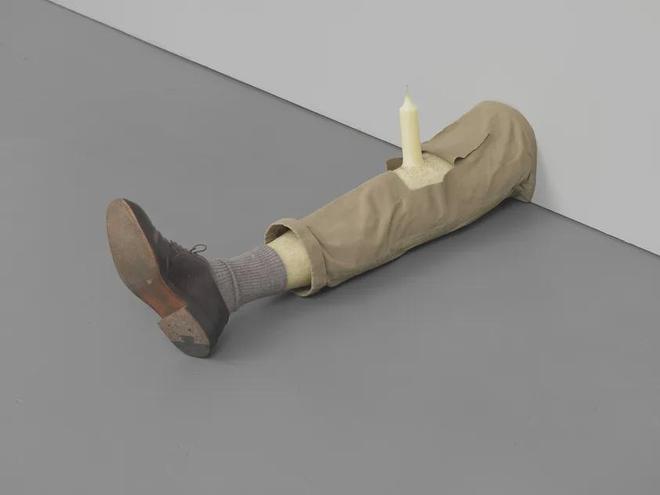 让我印象很深的有美国雕塑家Robert Gober设计的一条逼真“断腿”装置,蜂蜡皮肤、真人体毛、皮鞋与袜子,仿佛从墙面长出,强烈的拟真与残缺感让不少观众直呼瘆人。