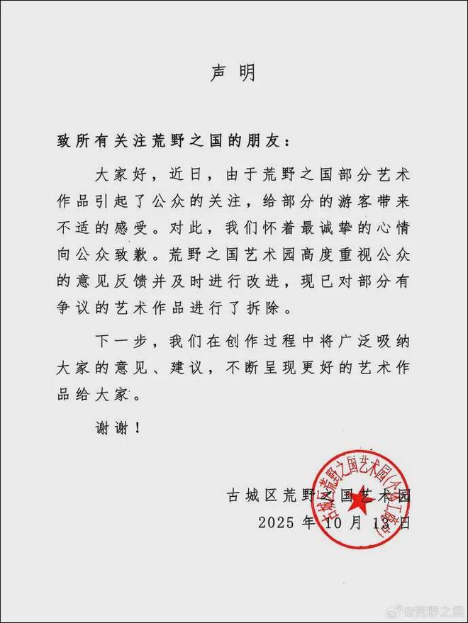 随后荒野之国发布道歉声明,称已拆除部分有争议的艺术作品。