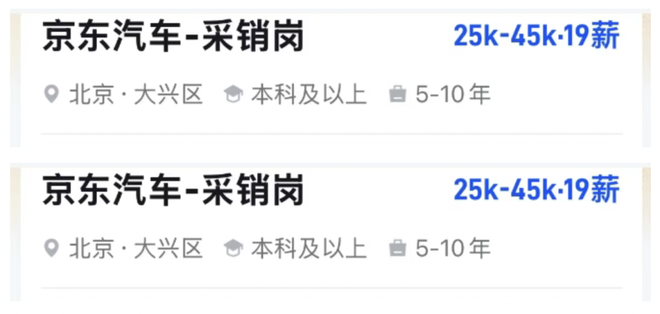 10月15日晚,某招聘平台显示,目前京东汽车已释放多个岗位。其中,零售事业部算法岗年薪最高可达123万元,对有汽车行业从业经历的候选人优先录取;汽车行业采销负责人年薪超过110万元,需要具备5—10年相关经验,熟悉汽车零部件采购流程及供应链管理。