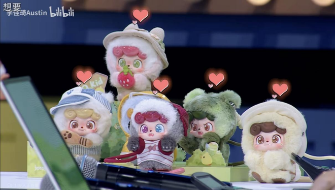 Q宝的当家红人地位给足了王老板自信,所以他自信地展出此次参加大促的价格:毛毛怪系列单个盲盒52.9元,出去玩系列59.9元(两款原价为69元),“后者更贵是因为升级了工艺、增加了配饰”,他在节目里解释道。