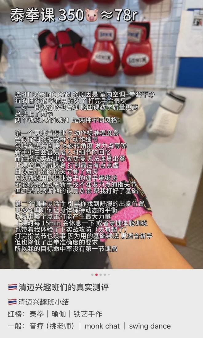 而且,价格优势明显,“花个美甲钱,就能跟着本地泰厨奶奶从菜市场学到餐桌;用北京半节私教课的费用,直接解锁带国际认证的泰拳课。而一些本地主流课程,比如泰拳、泰餐、瑜伽之类的,教学质量甚至都比国内更好。”