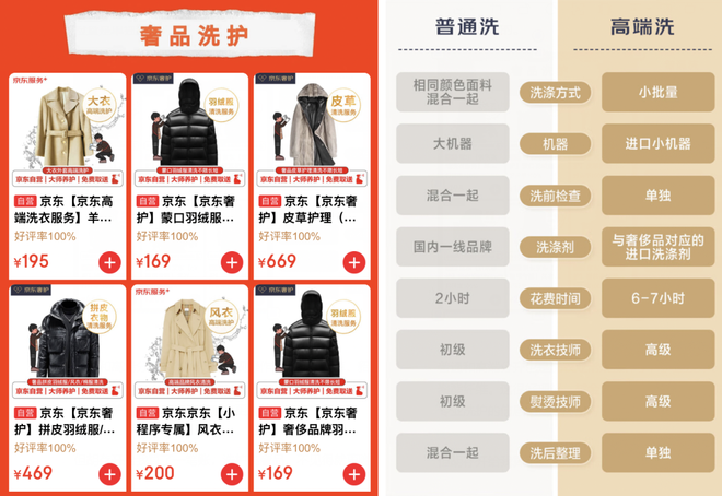 以京东洗衣为例,服务以2000元为界线,分为普通洗和高端洗。普通洗任洗两件羽绒服或两件大衣都能75元拿下,平台同时会提醒你,不要送价值2000元以上的衣物;高端洗则一件羽绒服169元,一件大衣195元,皮草更是要669元。