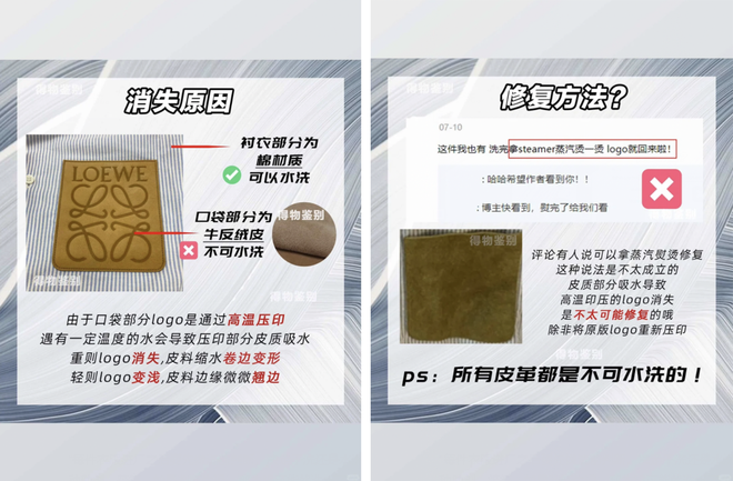 2022年有网友发帖吐槽自己新买的罗意威衬衫洗了一次胸前的logo就整个消失,“六千的衬衫秒变60”。得物出来科普说logo高温压印在牛反绒皮材质的口袋上,而牛反绒皮不可水洗,皮料吸水会变形,高温印压的logo一旦消失,就很难修复了。所以,为了保住这片logo,如果是单独清理需要用绒面刷或者干净的棉布蘸取清洗剂,整体清洗需要干洗。