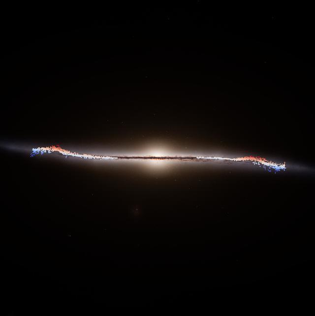 该波动通过可视化图像得到展现:成千上万颗恒星的位置以红蓝标记,覆盖在盖亚银河系地图之上。在“俯视图”中,银河盘面一侧向上弯曲,另一侧则向下(盘面的扭曲),而新发现的波动则以红区(恒星位于盘面之上)、蓝区(恒星位于盘面之下)突出标示。盖亚空间望远镜以无与伦比的精确度,能够获取恒星的三维位置及速度,为科学家绘制出这样的“顶视”“侧视”全景地图。数据显示,这股波动影响着距离银河系中心约3万至6.5万光年的恒星——而银河系直径约为10万光年。