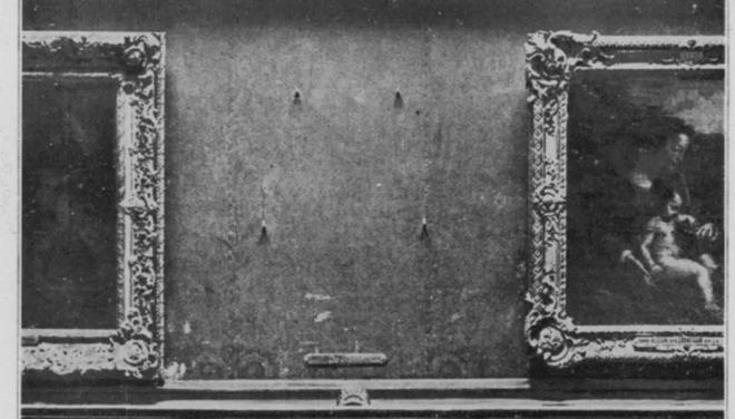 《蒙娜丽莎》失窃后的展墙,只剩下四颗钉子。