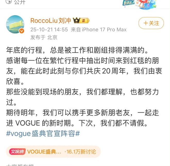 针对多位明星缺席的情况,VOGUE中国版主编刘冲发布微博称,“年底的行程,总是被工作和剧组排得满满的...下次我们不请假”,并为未能到场的艺人设置了视频请假环节。随后几位不能到场的明星分别发布了“请假视频”,目前贾玲以“自罚一杯酒”的幽默方式回应缺席,视频半天播放量破500万,#贾玲自罚一杯#曾登榜热搜前三。其他明星如李现、宋佳等也通过趣味视频解释缺席原因,相关话题阅读量超3.2亿。