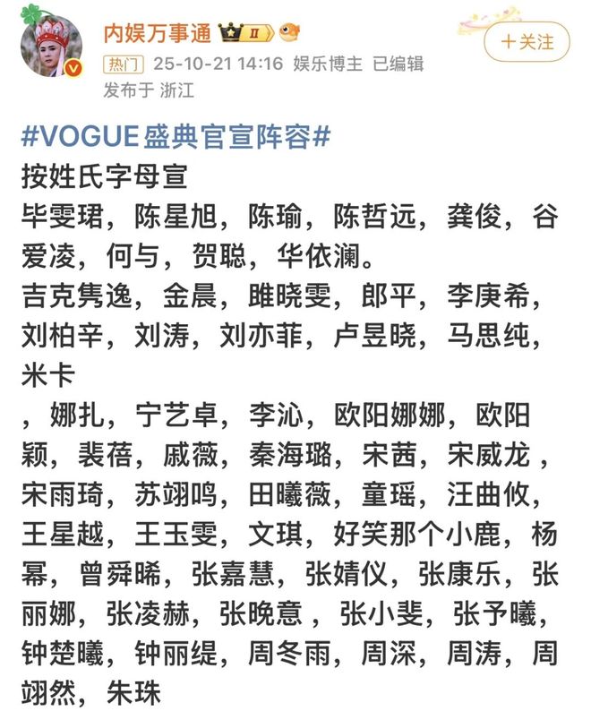 活动之前,网传阵容包含了迪丽热巴、王一博、赵丽颖、辛芷蕾等多位顶流大咖,最后均表示不能如期出席。而这场备受期待的时尚盛典的实际阵容,一共包括56名艺人,其中有刘亦菲、杨幂等少数顶流明星和其他新生代演员和艺人。