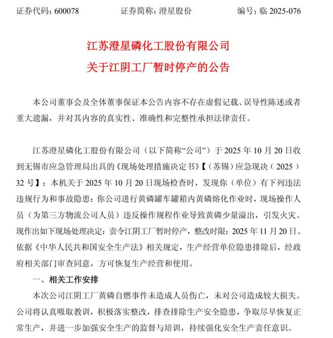 10月22日,澄星股份发布停产公告。原因是10月20日厂区突发黄磷自燃事故,幸好未造成人员伤亡。此次黄磷自燃事件并非澄星股份首次发生安全事故。2020年旗下子公司江阴澄星日化的磷酸钠盐车间就曾发生一起爆炸事故,导致1人受伤。这次安全事故的停产对于刚刚摆脱亏损困境的澄星股份的声誉和市场信心带来一定的损伤,股价随即下跌9.48%。