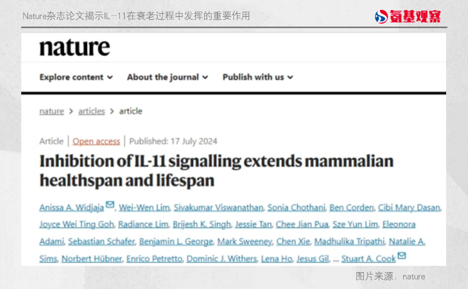 去年发表在Nature杂志上的一篇研究论文"Inhibition of IL-11 signalling extends mammalian healthspan and lifespan",揭示了IL-11在衰老过程中发挥的重要作用。科学家们通过实验发现,抑制IL-11信号通路可以显著延长哺乳动物的健康寿命和总寿命。