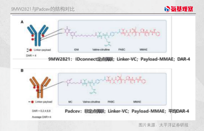 其中,9MW2821作为迈威生物的核心产品,是首个启动临床的国产Nectin-4 ADC。如下图所示,相比全球首个获批的Nectin-4 ADC Padcev,其在偶联技术和连接子上做了优化,采用半胱氨酸桥定点偶联,具有更好的均一性,同时使用定点连接子接头IDconnect™替换了马来酰亚胺(MC),使得稳定性更好。