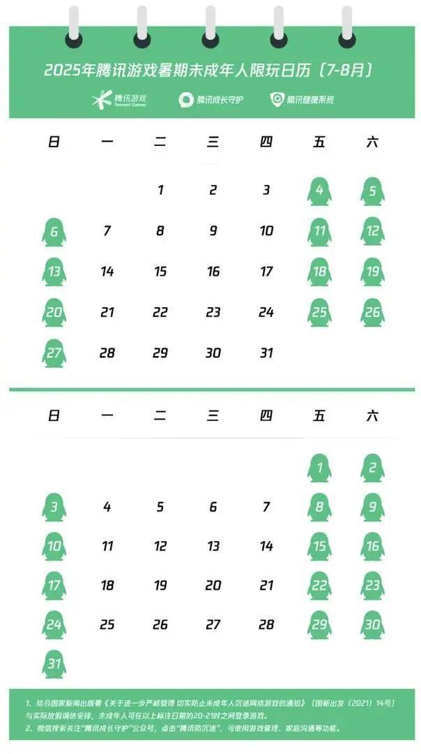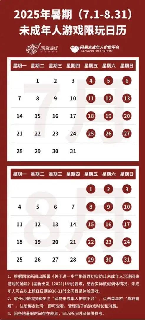 随着暑期来临,未成年人网络使用需求显著上升。为防止未成年人沉迷游戏,近日,网易游戏、腾讯游戏分别发布了2025年暑期未成年人限玩日历(7月1日至8月31日),两家企业均采取严格时段限制措施,规则基本一致。