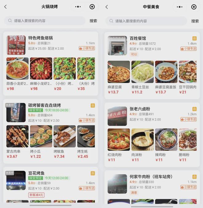 当地的外卖小程序上线了二三十家餐馆,除了家常炒菜以外,还有本地特色的烤鱼、卤粉等,生意好的店铺销量能够达到过千。