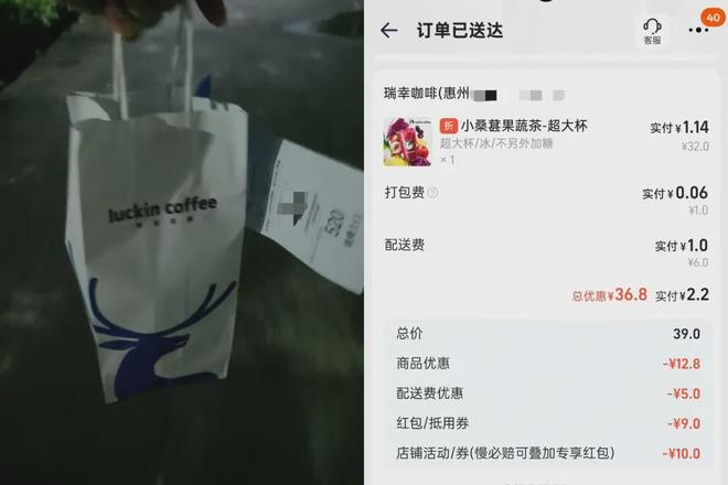网友fallin居住在四川德阳的一个乡村,今年30岁。第一次在村里点外卖“正是大夏天很热的时候,嘴巴也馋”,因为想喝冷饮,看到平台有折扣还免配送费,就花6块钱点了一杯瑞幸。